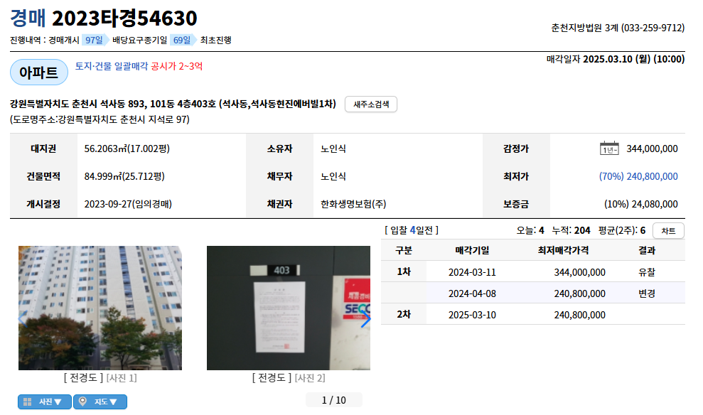 해당 경매 물건은 2024년 3월 11일 1차 경매에서 유찰되었으며, 이후 최저 매각 가격이 감정가의 70%인 2억 4천 80만 원으로 조정되었습니다. 2차 경매는 2025년 3월 10일 오전 10시에 진행될 예정이며, 입찰을 원할 경우 보증금(최저가의 10%)을 준비해야 합니다.