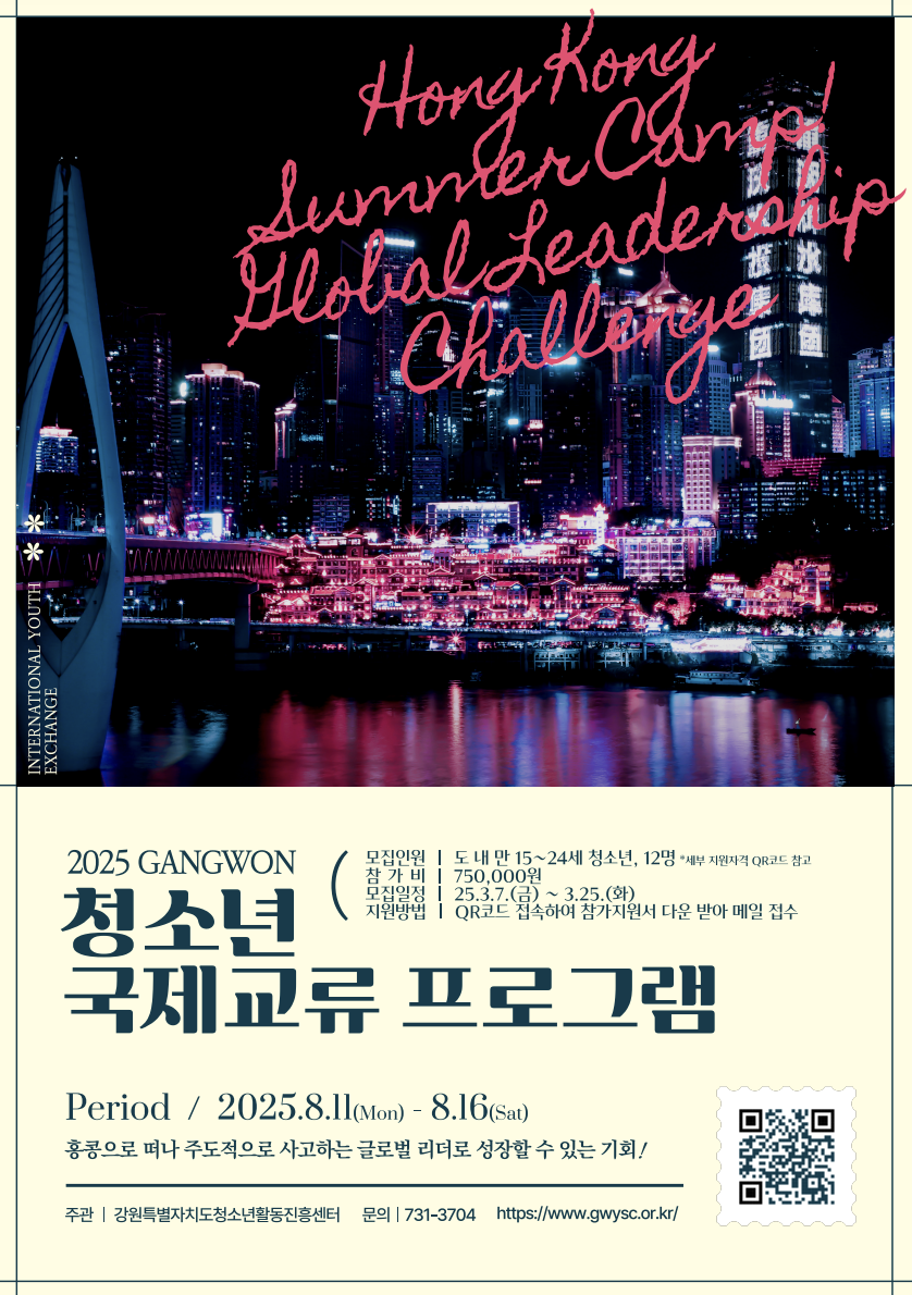 "글로벌 리더가 되고 싶다면? 강원 청소년들을 위한 최고의 국제 경험, 홍콩에서 펼쳐지는 글로벌 리더십 챌린지에 도전하세요!"